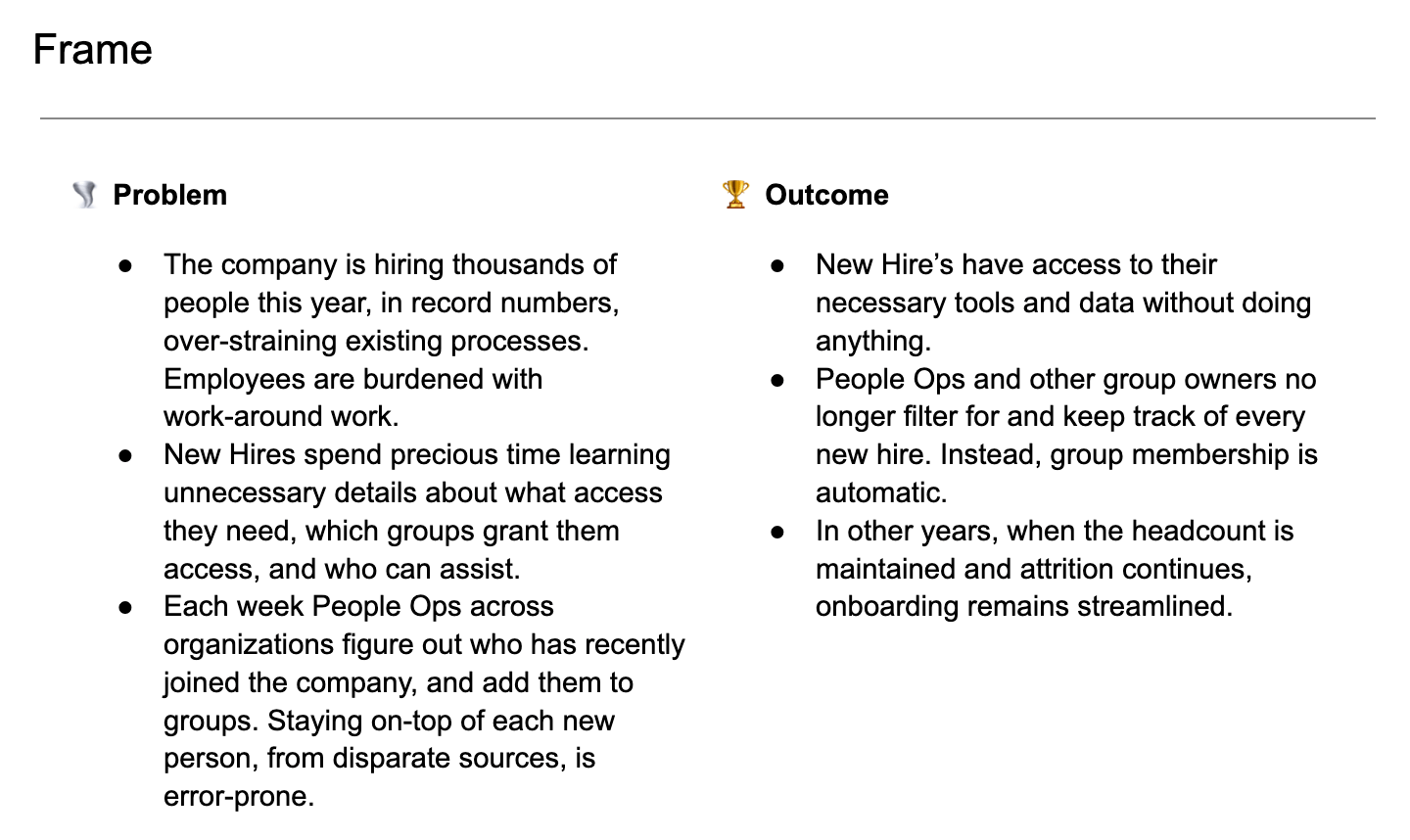 FramingBefore I joined, the Director and Product Leader decided that my team will focus on the Employee Onboarding process for the 10K-person company. This direction was convyed to me from our organization's Product Leader.