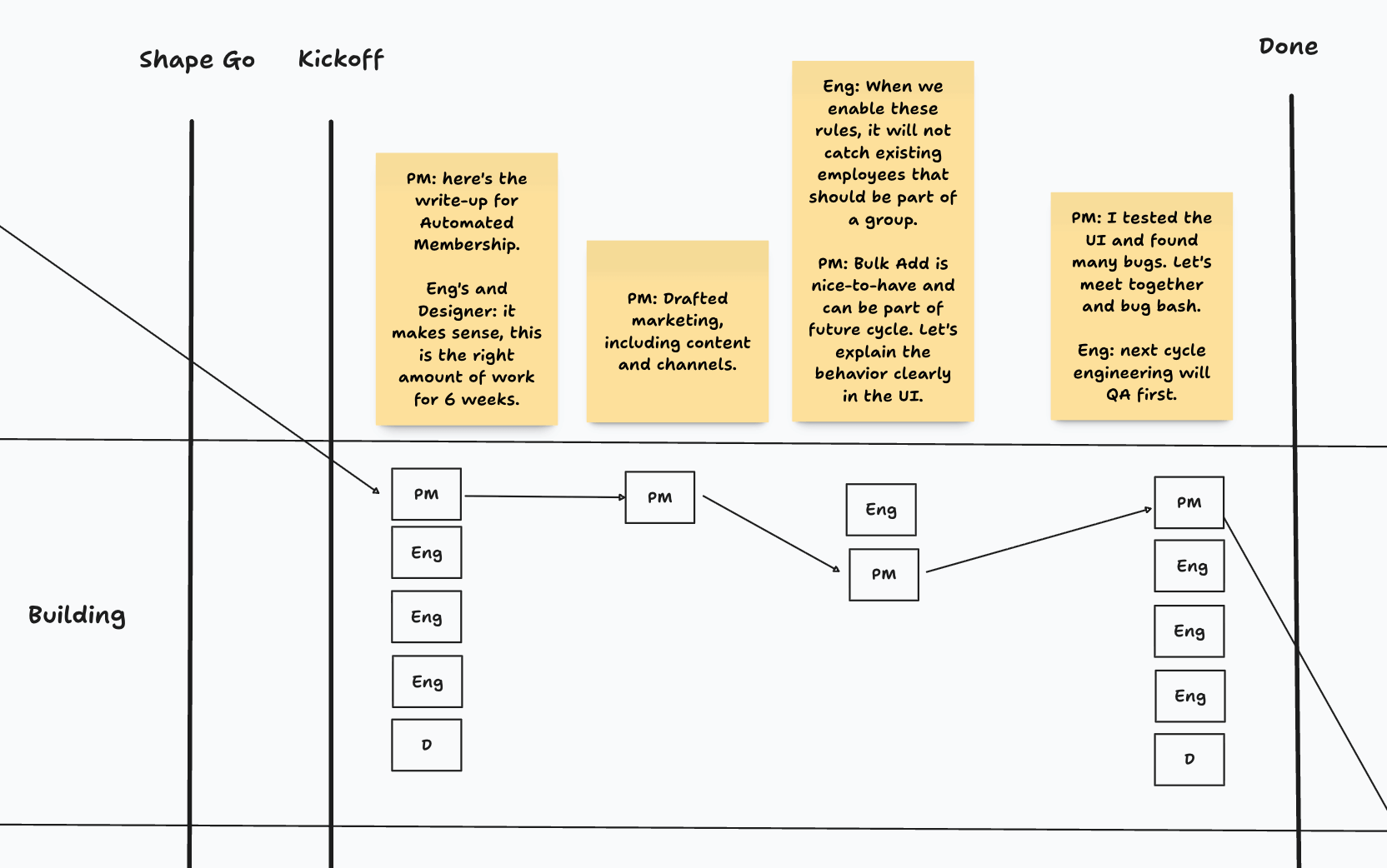 To initiate building, I wrote the Frame and Shape in one document, the product pitch. Then I shared it with the whole team in our kick-off meeting. The other engineers digested the document and asked clarifying questions. They understood what to build and created a plan of attack.