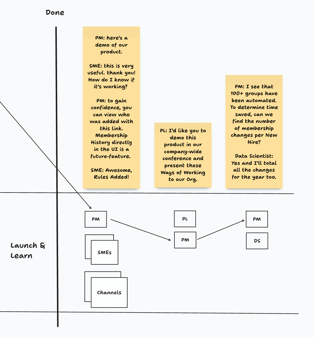 Our Product Leader asked me to demo the product in our company-wide conference. I also presented our Ways of Working to our 50-person organization. With support from leadership, we iterated with two more build cycles and I tracked impact. Over 100 groups were automated, saving approximately 10 minutes per each onboard.